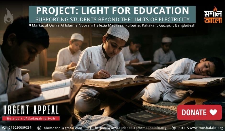 গাজীপুরের কালিয়াকৈর উপজেলার ফুলবাড়িয়ায় অবস্থিত মারকাযুল কুররা আল ইসলামিয়া নূরানী হাফিজিয়া মাদ্রাসা একটি সুপরিচিত দ্বীনি শিক্ষা প্রতিষ্ঠান। এখানে ১০০ জনেরও বেশি ছাত্র ও শিক্ষক নিয়মিতভাবে পাঠ কার্যক্রমে অংশগ্রহণ করেন। কিন্তু দেশে চলমান লোডশেডিং ও তীব্র গরমের কারণে আবাসিক শিক্ষার্থীরা প্রতিনিয়ত কষ্টের মধ্যে দিয়ে যাচ্ছে। বিশেষ করে হিফয বিভাগের বাচ্চারা রাতে বিদ্যুৎ না থাকায় ঠিকভাবে ঘুমাতে পারে না। অনেক সময় গরমে অতিষ্ঠ হয়ে রাত কাটাতে হয়। ফলে ভোরে উঠে কুরআন পড়ার সময় তাদের মনোযোগ ও শক্তি দুটোই কমে যায়। হিফয বিভাগের বাচ্চাদের এই সমস্যার সমাধানে আমরা Light for Education 2026 প্রজেক্টের মাধ্যমে একটি আইপিএস স্থাপনের উদ্যোগ নিয়েছি, ইনশাআল্লাহ্। আলহামদুলিল্লাহ, বেশিরভাগ অর্থ ইতোমধ্যে সংগ্রহ হয়েছে। এখন অল্প কিছু অর্থ বাকি। রাসূলুল্লাহ ﷺ বলেছেন, “যে ব্যক্তি কোনো মুমিনের একটি কষ্ট দূর করে, আল্লাহ কিয়ামতের দিন তার কষ্টসমূহের একটি কষ্ট দূর করে দিবেন।” - সহীহ মুসলিম এই উদ্যোগে আপনাদের অংশগ্রহণ প্রয়োজন। **Find us:** [Facebook](https://www.facebook.com/moshalalo.org) | [Instagram](https://www.instagram.com/moshal.alo/) | [LinkedIn](https://www.linkedin.com/company/moshal-alo) | [YouTube](https://www.youtube.com/@moshalaloorg)